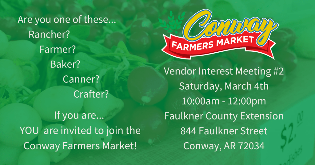 Vegetable and fruit farmers are invited to a Vendor Interest Meeting on Saturday, March 4, at 10 a.m. at the Faulkner County Extension office, located at 844 Faulkner Street in Conway. Attendees will hear a brief history of the market, meet the board of directors, learn about state laws for vendors, and discuss the market’s rules and regulations. Those interested in participating in the 2023 market are welcome to apply on-site at the meeting or online at www.conwayfarmersmarket.org. The market strives to maintain a 60/40 split between farmers and crafters, with 60% being farmers. With more farmers participating, the market can accommodate additional crafters.