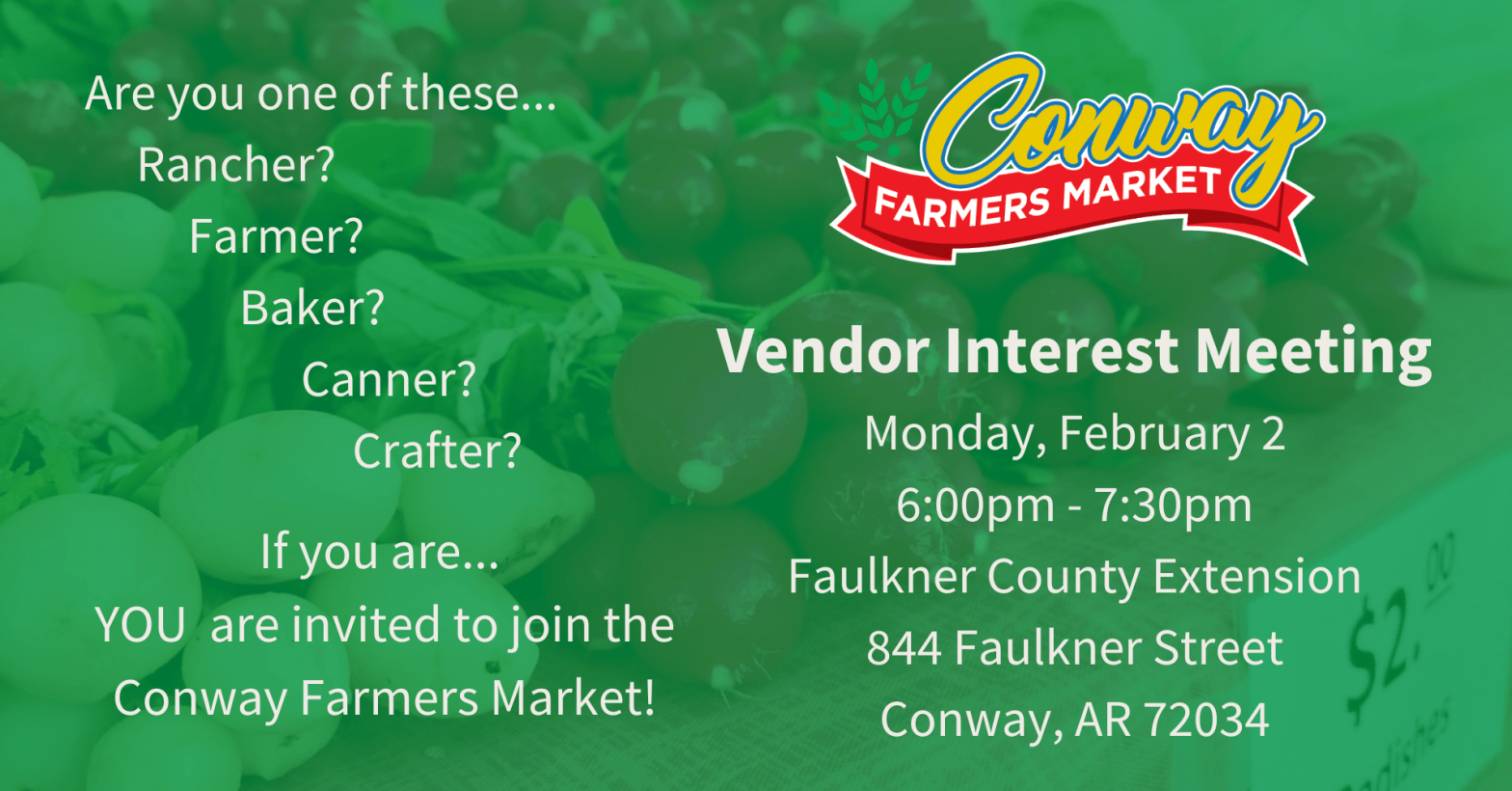 The Conway Farmers Market team is hosting our upcoming Vendor Meeting on Monday, February 2nd at 6:00 PM! This is your chance to: